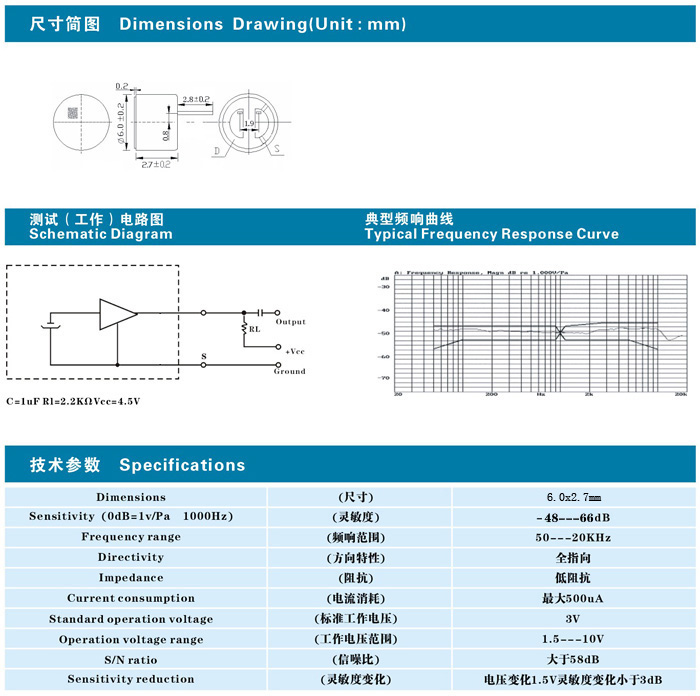 规格:φ6.0*2.7mm焊点式全指向麦克风