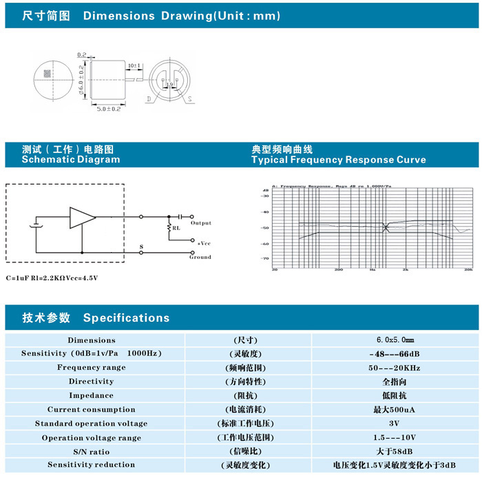 规格:φ6.0*5.0mm插针式全指向麦克风