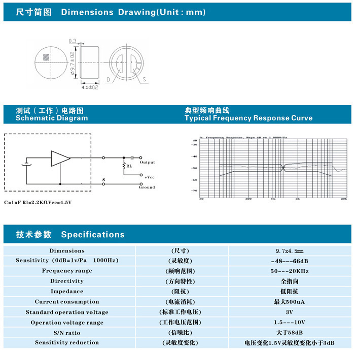 规格:φ4.5*2.7mm插针式全指向麦克风
