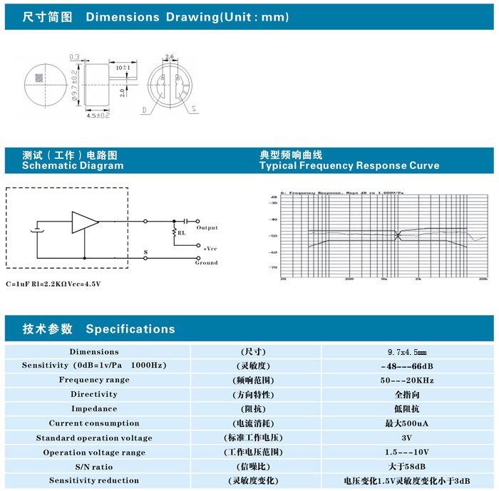 规格:φ4.5*2.7mm插针式全指向麦克风