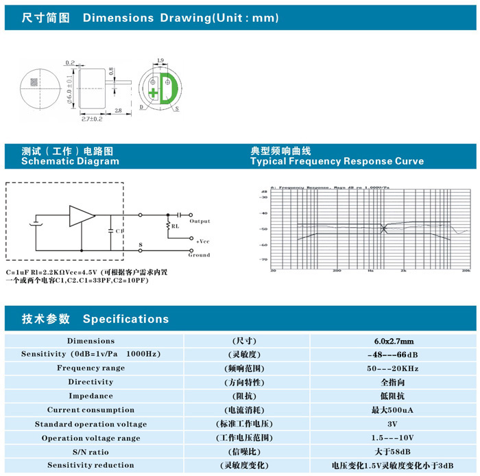 规格:φ6.0*2.7mm焊点式全指向麦克风